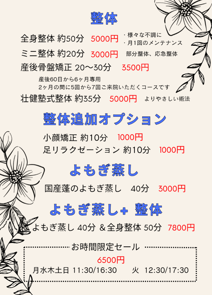 🌷全身に不調がある方は、全身整体をお選びください。(お子様同伴は産後骨盤矯正、ミニ整体のみOK)